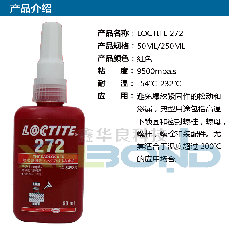 樂泰272是由樂泰膠粘劑廠商研制的一款螺紋鎖固厭氧膠,這款膠水具有高強度耐高溫等特點,最高可以承受232攝氏度的高溫,可以用于氣缸頭雙頭和M36以下的螺紋緊固,也可用于高溫場合螺紋的永久性鎖固,在鎖固之后如果需要拆開的話就需要在加熱之后使用工具拆卸