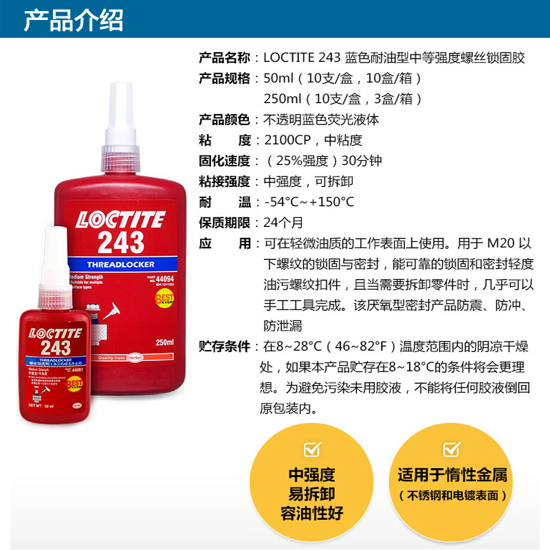 樂泰243膠水是一種單組分,觸變性,中等強度,厭氧型螺紋鎖固膠。loctite243在隔絕空氣的條件下,在兩個緊密配合的金屬面間固化。尤其適用于惰性表面,例如不銹鋼和電鍍表面。