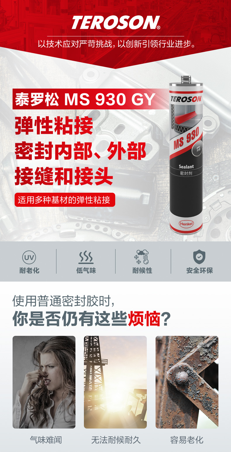 泰羅松MS930是一款單組份、多用途、濕氣固化的觸變型改性硅烷密封膠/粘合劑。它常見顏色有白色、灰色和黑色,適合涉及多種基材的不同應用。該密封膠以MS聚合物為基材,與空氣中的水分反應生成柔軟的彈性體,具有良好的密封和粘接性能。