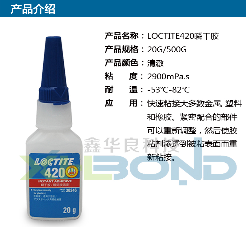 樂泰420是一種單組分,快速固定,室溫固化,通用工業級氰基丙烯酸酯膠粘劑。loctite420的低粘度特性使它非常容易透過預組裝的部件。樂泰420使用經濟,對金屬、塑料和橡膠具有強烈粘接性能。